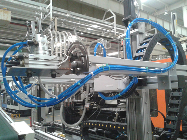 2014年10月,我們成功為格力電器公司研發(fā)出一款可以自動(dòng)抓取風(fēng)葉進(jìn)行動(dòng)平衡檢測(cè)的機(jī)械手?照{(diào)外機(jī)的風(fēng)葉經(jīng)注塑機(jī)注塑成型后由機(jī)械臂取出并放置到皮帶線上送走。機(jī)械手和注塑機(jī)配合,定期接取風(fēng)葉放置到動(dòng)平衡機(jī)上進(jìn)行抽檢,合格后自動(dòng)抓取放回皮帶線,不合格則報(bào)警提示。